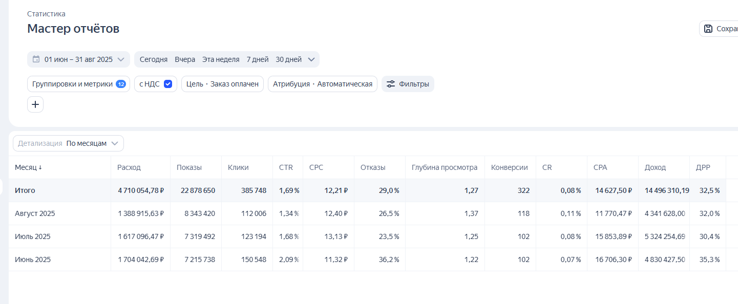 За 3 месяца работы увеличили расход на 100% и уронили CPA на 30%. Заказов при этом стало на 200% больше.